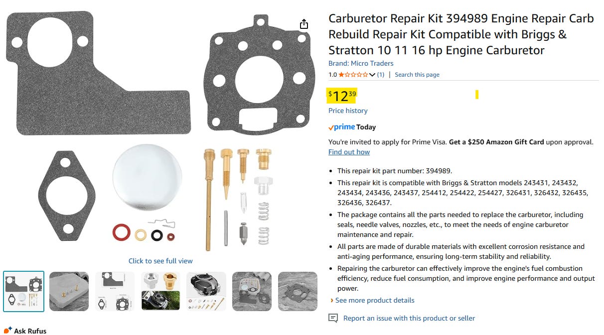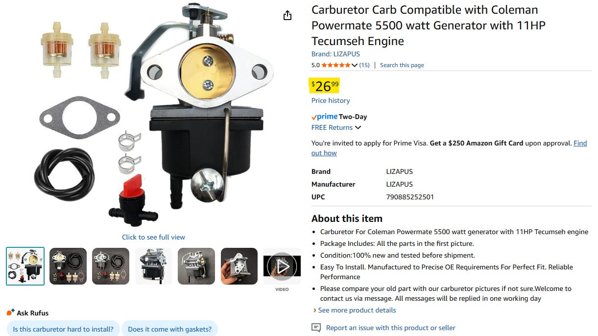 We are living in the great age of information and there are many good people making videos on fixing just about everything including changing the innards of a Tecumseh 11HP engine carburetor that runs the generator. So, my next step was to buy the repair kit which truthfully is inexpensive as heck, the blessing of old reliable stuff.
