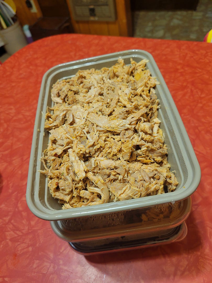 My final tally was seven pounds of pulled pork loin. Add one buck per pound for “costs" and my price per pound is $4.25