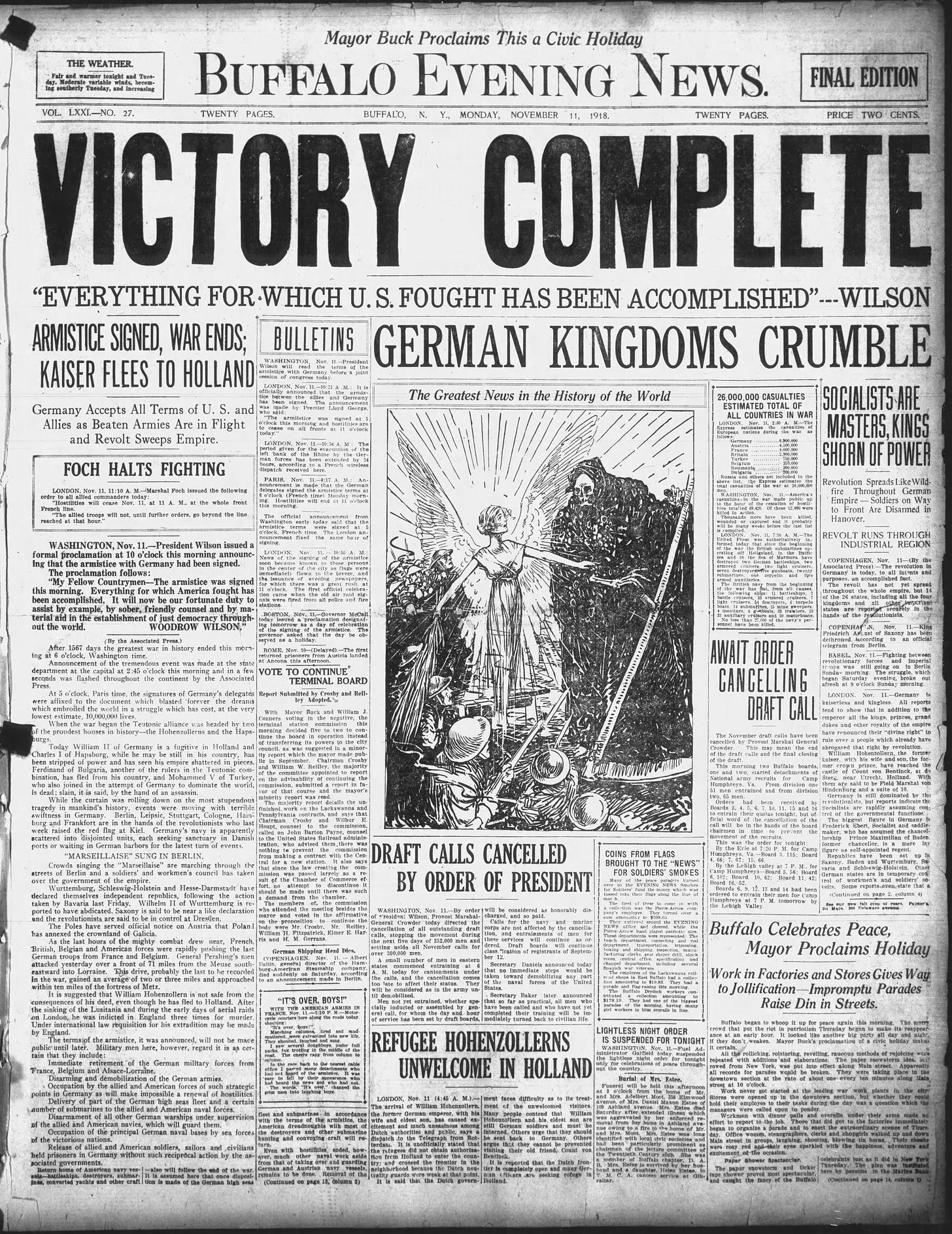 Yes, the fighting was ended but the war was not officially over until the Versailles Treaty was signed. That document sowed the seeds of an even more terrible war not quite twenty years later. Peace is an elusive thing, even today.